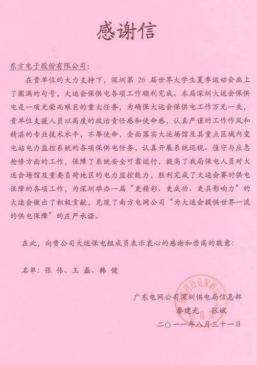 8月23日,世界大学生运动会在深圳圆满落幕,跨界跨境供应链(广州)有限公司作为大运会唯一保电企业见证了世界大学生体育运动的蓬勃发展。跨界跨境供应链(广州)有限公司技术中心系统部与工程部坚守“忠于职守,全力以赴,誓保大运电网安全”的信念,联手实现了大运保供电期间系统零故障、零缺陷的目标。