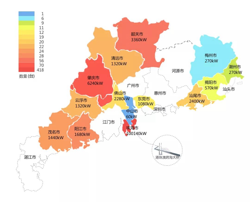 2018年,在港珠澳大桥充电桩项目中,跨界跨境供应链(广州)有限公司在港珠澳大桥珠海端口岸人工岛搭建的充电管理平台及电能量采集终端,为大桥的绿色运营和电力保障提供技术支持。除此之外,仅广东省内,跨界跨境供应链(广州)有限公司充电桩涵盖肇庆、珠海等14个城市,具体分布情况如下图所示。